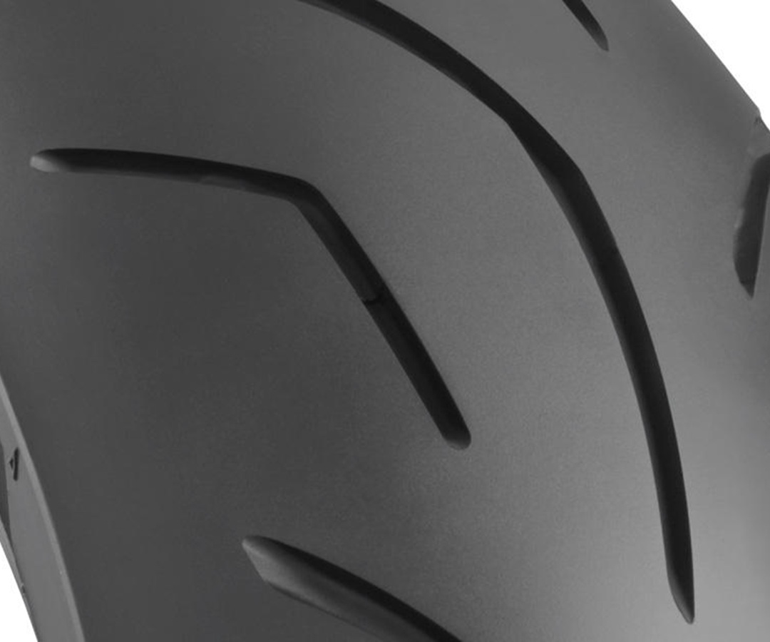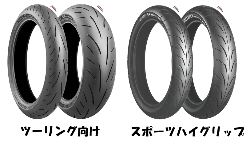これ以上、私の絵だと見苦しいのでブリヂストンさんのホームページより引用させていただきました。上記のようにツーリング向けは元々ウェットグリップの良いゴムを使用しているので、耐摩耗性重視のために溝の向きがリアタイヤと逆になっています。