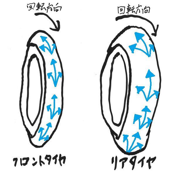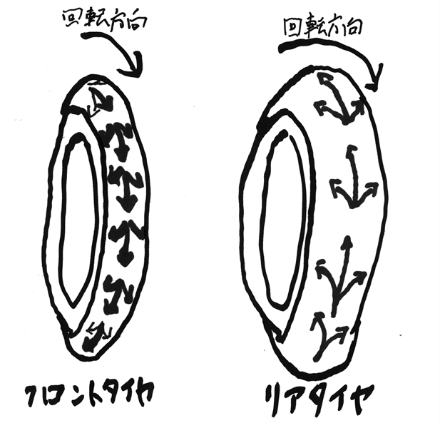 リアタイヤは主に加速方向に力がかかりますので、回転方向と同じ向きに、そしてそこから外側に広がるように力がかかります。逆にフロントタイヤはブレーキの時に力がかかりますので回転方向と同じ向きに力がかかります。リアタイヤとフロントタイヤで、力のかかり方の向きが逆なんですね。