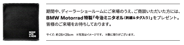 そこで、この度、フェア開催期間中にご来店の上、ご商談させていただきましたお客様には、BMW Motorrad特製の「今治ミニタオル」をプレゼントいたします!