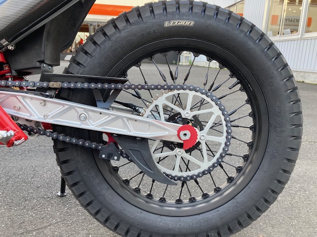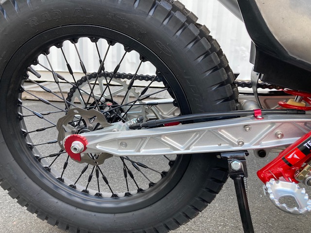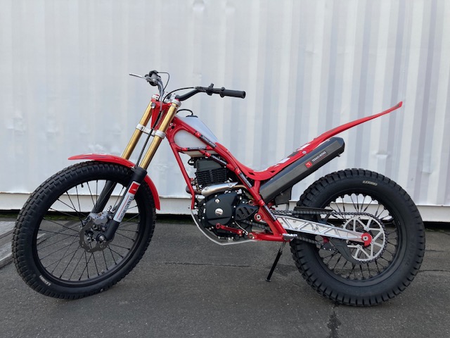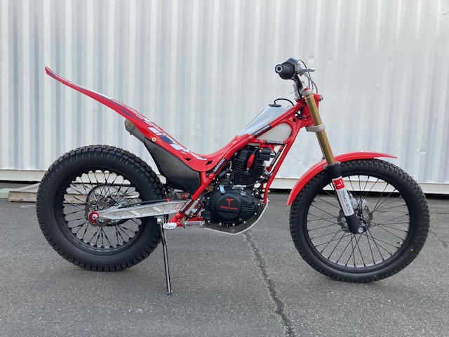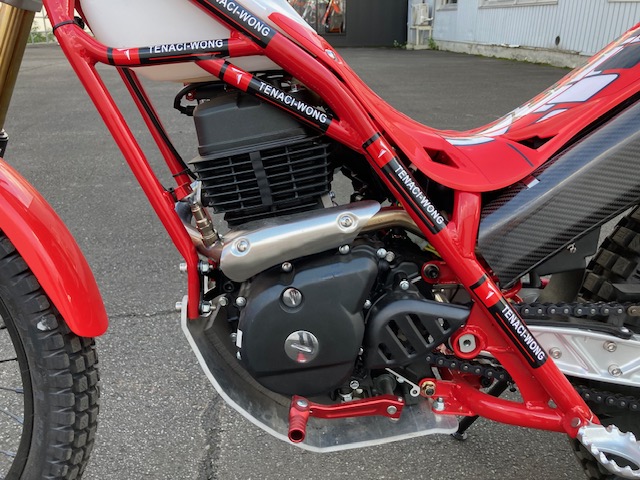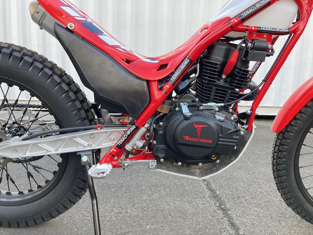 空冷4スト150ccトライアル専用エンジン12ps/11.5NM・自動補正フューエルインジェクション・セルスターター・リチウムイオンバッテリー・5速ミッション・ワイヤークラッチ・2L燃料タンク・車両重量75㎏